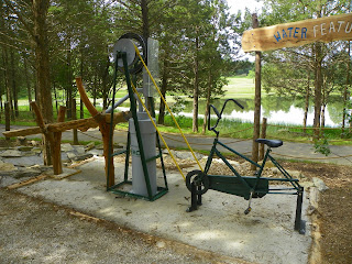 | In this nature classroom, you pedal the bike to pump water down the trough; it was a good work out. |