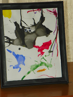 the grands and I had art day this week. I found this project on Pinterest. Instructions were to put paint on paper and blow with a straw. The paint didn't seem to move very good. The second photo is blowing with a straw. The top picture was made by dropping blobs of paint on the paper, folding it in half and rubbing it with your hand. This technique seemed to work better. The grands added the googly eyes to make monsters.