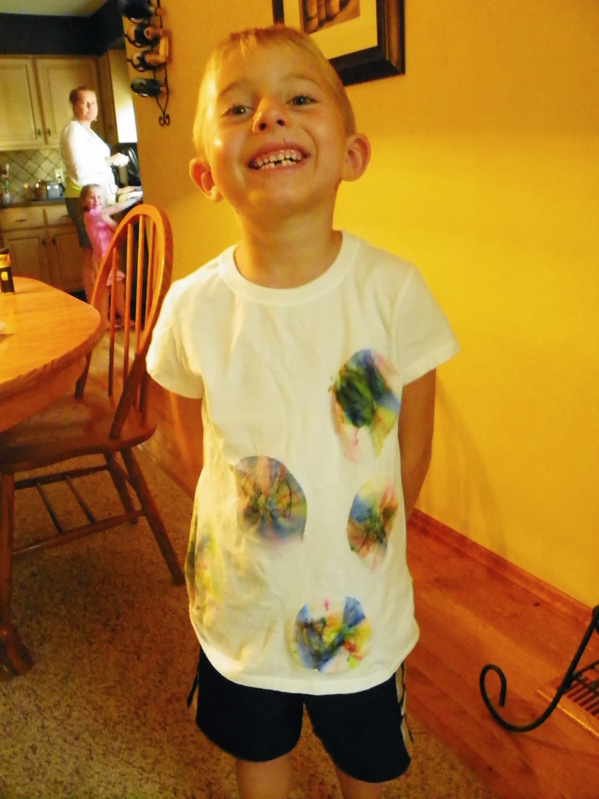 the second craft used rubbing alcohol and sharpie highlighters. We placed our t shirts over a plastic cup, fastened with a rubber band and drew shapes with the sharpie.
