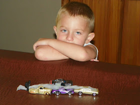 one of d's inventions, taped cars together so he can play with all of them at once. Ok, I'm sure when my kids were 4 they didn't know the word invention or if they did they didn't talk about inventing things. D is always inventing things, and explaining his ideas to us. He wants to invent a scooter with an unbrella so you can ride in the rain. He is always building things with his tinkertoys and blocks. Think he gets it from his dad and great grandpa.