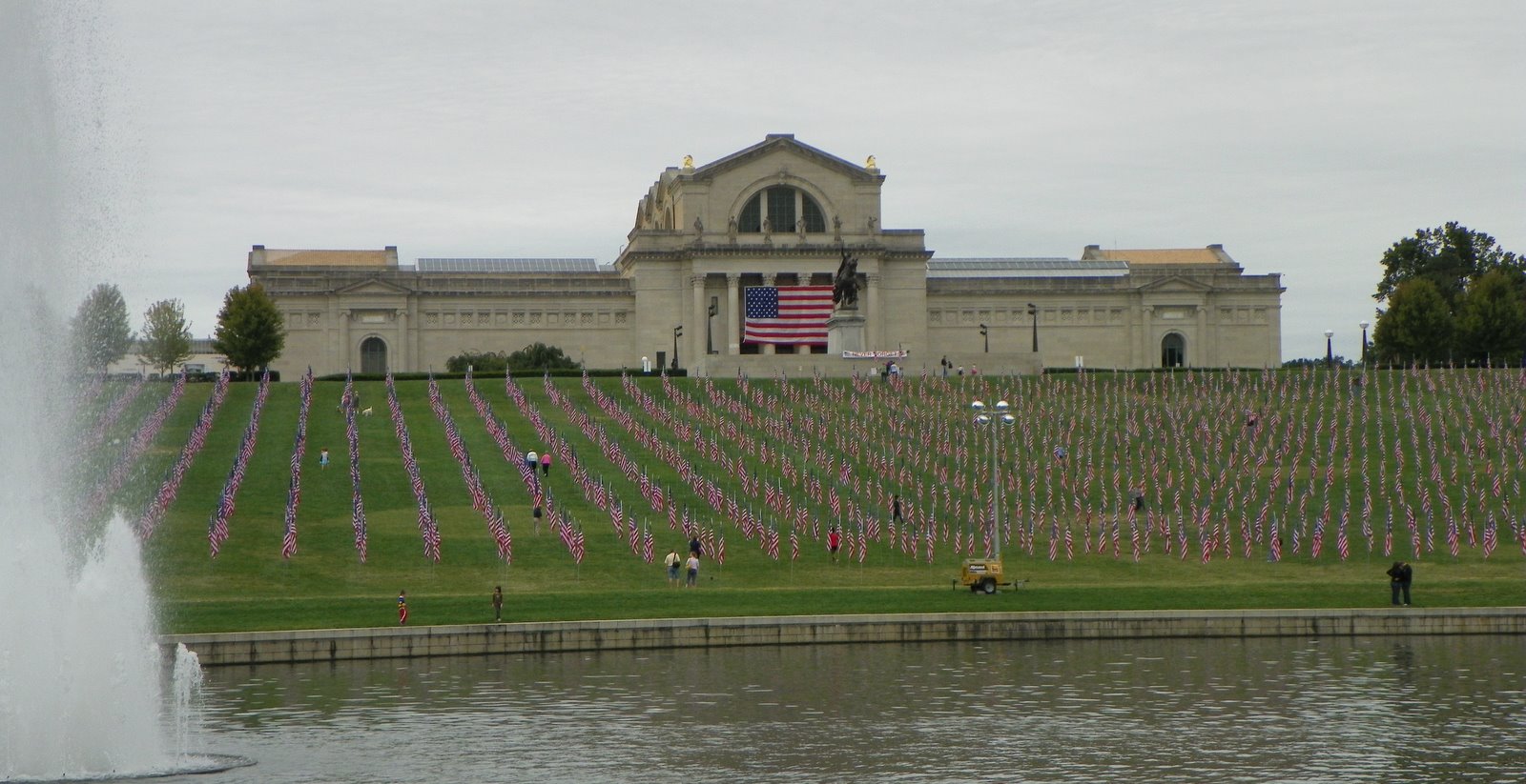 yesterday I ventured to Forest Park to be a part of this remembrance of the victims of 9/11. A number is just a number until you can see it. There was a flag for each person killed, laid out in military precision. The view is from the Grand Basin looking up to Art Hill and the Art Museum. Breathtaking.
