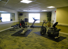 the exercise room, down the hall from me. Everyone has made me feel so welcomed. The activity calendar is jam packed with thing to do every day. There is a big community room and kitchen for entertaining, a library, computer lab, big screen tv for watching movies and several sitting areas. I used the patio area a lot when I finished moving in.