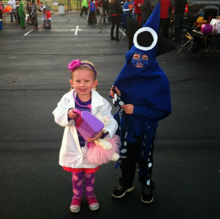 Doc McStuffin and a giant squid. Mr. D decided that grandma's so good with the sewing machine so this year he requested a giant squid costume, complete with tentacles and suckers.