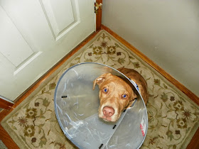 He is sporting his new fashion accessory and he hates it. He managed to get it off the last time I was babysitting and it was a fight to get his head back thru it.